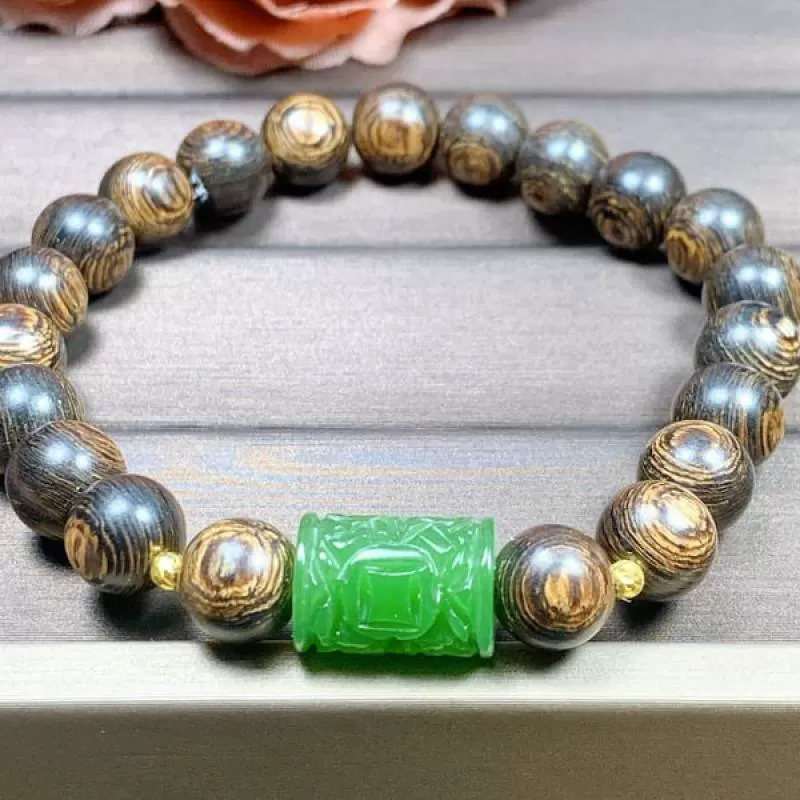 Vòng tay Trầm hương sánh 8mm mix bi vàng và lu thống ngọc bích